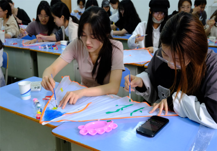 繪畫過程中,同學們時而凝神靜思,時而揮毫潑墨、暈染色彩,整個教室充滿了創作的喜悅與激情。他們不僅是在繪制紙鳶,更是在用心靈與自然對話,用畫筆記錄著對美好事物的感悟與追求。每一筆、每一劃都不僅僅是顏色的堆砌,更是同學們無限創意與滿腔熱情的凝聚。同時,在這個過程中,中外學生不時交流著各自的設計理念與色彩搭配的心得,空氣中彌漫著輕松愉悅的氛圍。本次繪畫過程不僅極大地提升了同學們的動手能力和審美素養,而且搭建了一個促進中外學生藝術交流的橋梁,通過親手繪制紙鳶,同學們對我國的傳統民俗藝術有了更加直觀而深刻的理解與認同。