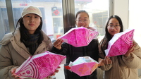 隨后,師傅憑借精湛的手藝,迅速將長短不一的葦蒲桿組合成精巧結實的魚型骨架,造型簡約而不失美感。在介紹紙張時,師傅著重強調了“魚肚子紙”和“魚衣子紙”的關鍵作用。只見師傅將普通白紙裁剪后,用手工漿糊把“魚肚子紙”貼在骨架上下兩側,接著在魚形印版涂紅,鋪上白紙用蘿卜壓實,制成“魚衣子紙”并貼于魚身,最后用特制涂料上色,一盞魚燈籠便大功告成。