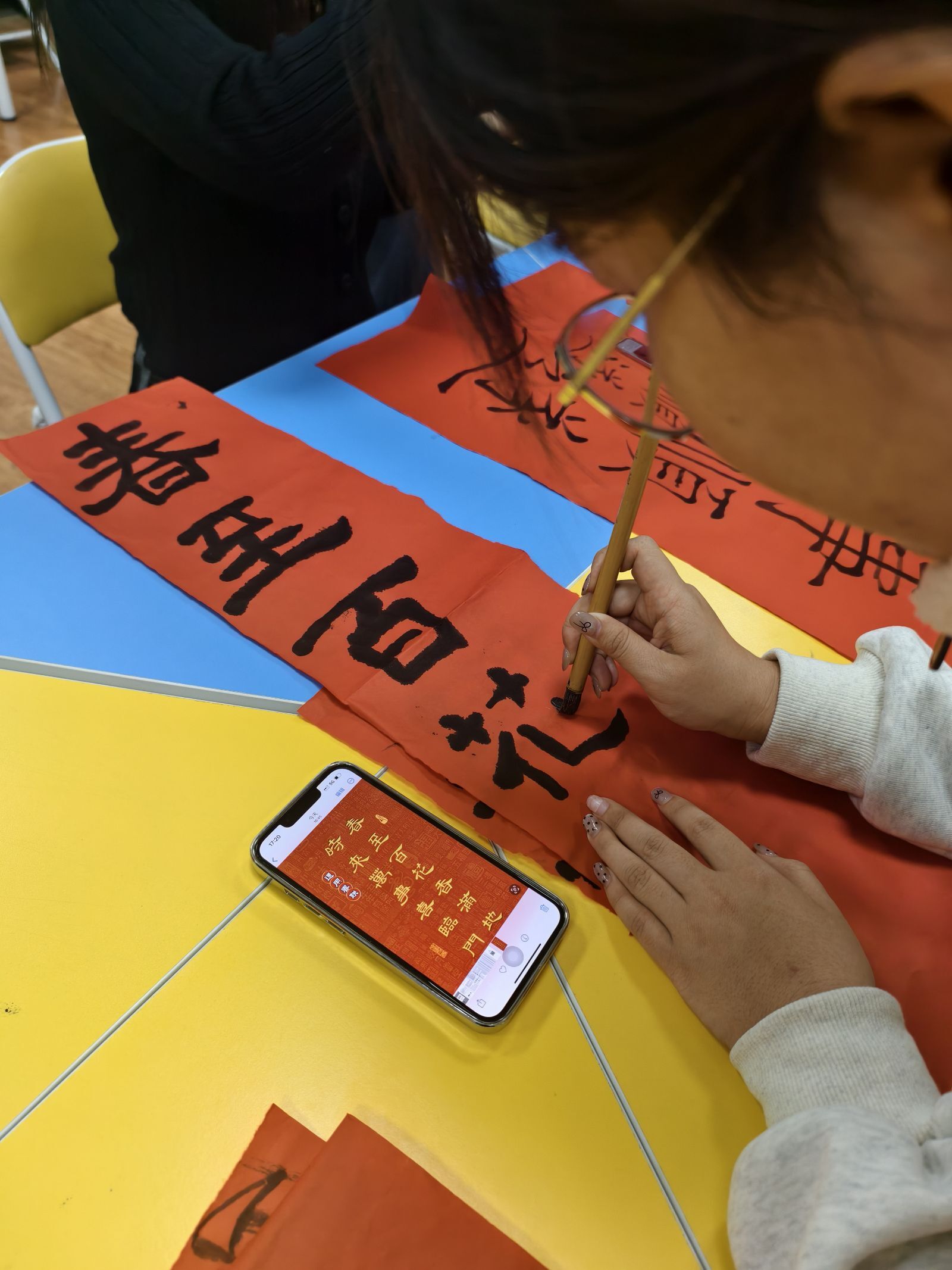 隨著春節的腳步日益臨近,煌·筑夢鄉村振興促進隊的成員們帶著滿滿的熱情,聚集在一起,開展了一場別開生面的寫對聯活動;顒蝇F場,書法愛好者們揮毫潑墨,一筆一劃間盡顯中華書法的韻味與魅力。對聯內容既有對美好生活的祝愿,也有對鄉村振興的深切期盼,既傳遞了節日的喜慶,又蘊含了對鄉村未來的美好愿景。這些對聯隨后被贈予了學校周邊村莊的村民,為他們帶去新春的第一份祝福。