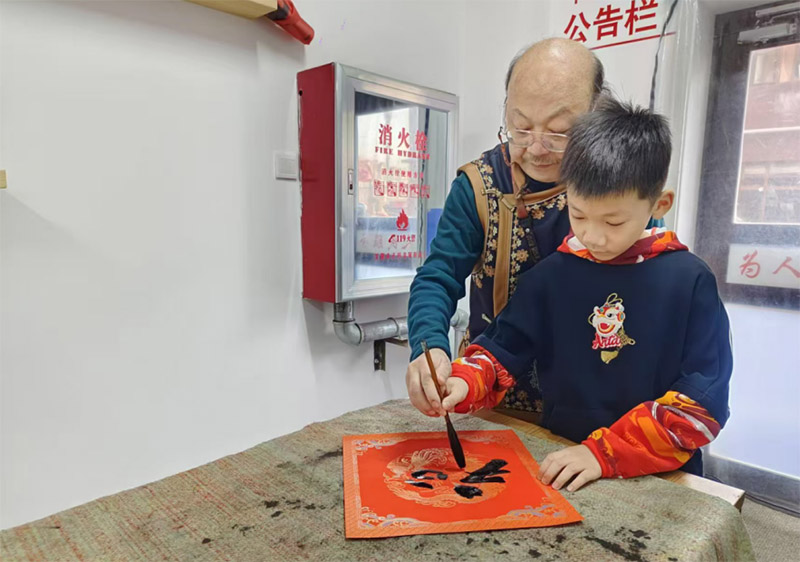 孩子們也在一旁躍躍欲試,在長輩的指導下,一筆一劃認真書寫,那專注的神情仿佛在創作最珍貴的藝術品。