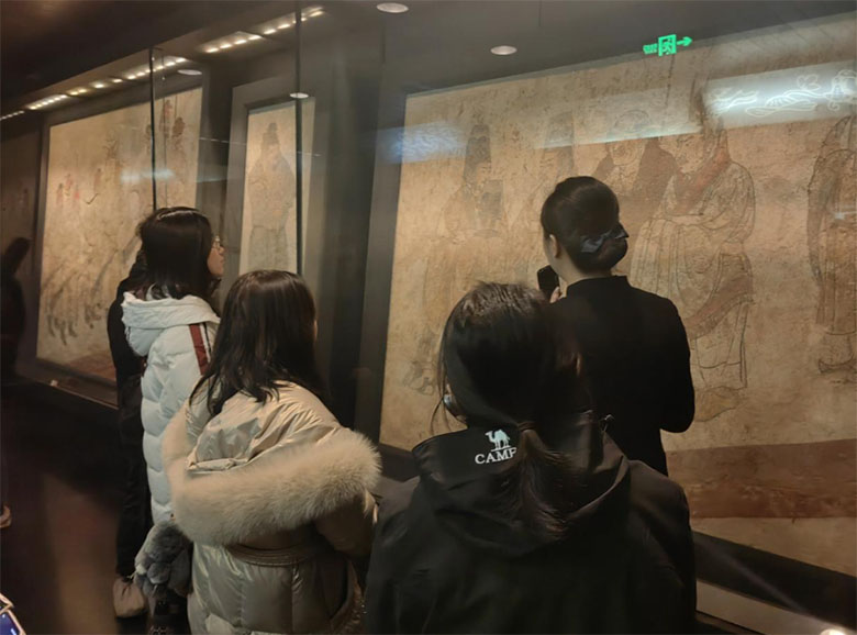 實踐隊隊員隨后在講解員的帶領下參觀了陜西歷史博物館的壁畫珍寶館。描繪了唐代貴族狩獵時的場景的章懷太子墓壁畫《狩獵出行圖》、描繪唐朝官員接待外國使節的場景的《客使圖》、氣勢宏偉的懿德太子墓室壁畫《闕樓儀仗圖》……眾多壁畫細膩的筆觸、豐富的色彩,讓隊員們紛紛駐足觀賞。些壁畫就像是一部活生生的歷史畫卷,讓實踐隊隊員們對唐代的社會風貌有了更直觀的了解,仿佛穿越時空,與古人進行了一場對話。