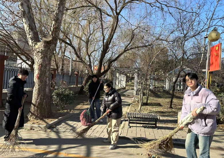圖為實踐團成員李樂佳、王宇坤、張杰、楊慧樂打掃院子整理工具