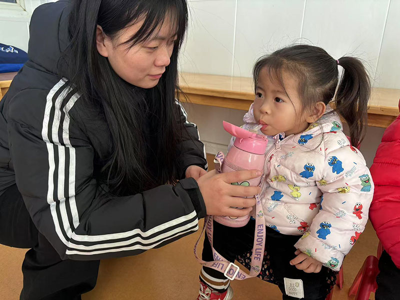 圖為實踐團成員孔樂怡喂剛剛做游戲的孩子喝水