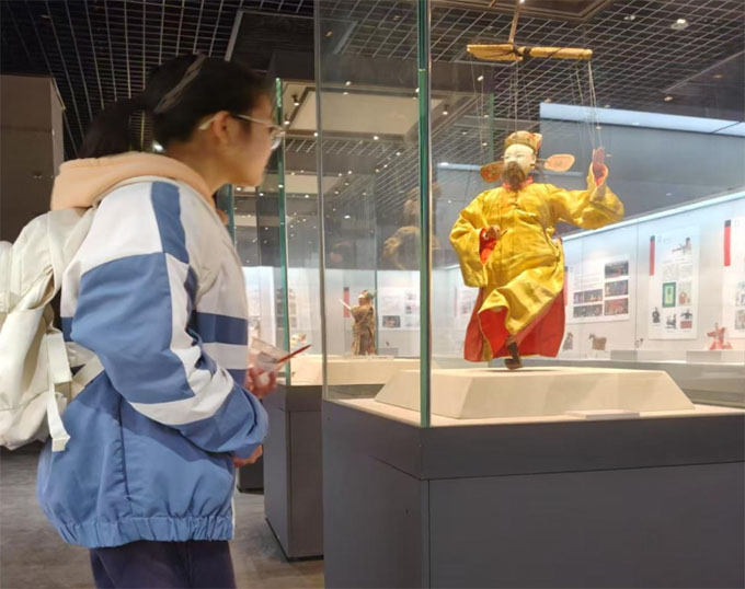 在貴港博物館,實踐團成員參觀了木偶展覽廳。沿著蜿蜒的走廊,各式各樣的木偶展示了豐富的文化故事。每一個木偶的姿勢和服裝都各具特色,仿佛在講述不同的歷史片段。成員們沉浸其中,對木偶非遺文化有了更深入的了解和欣賞。