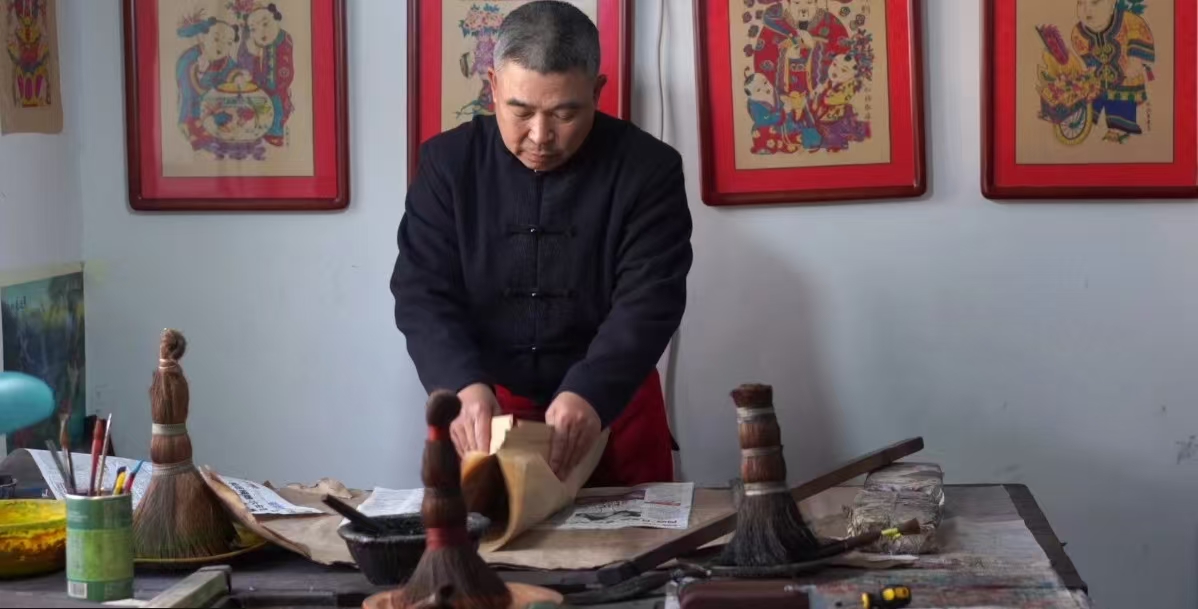 三、實踐單位及崗位介紹實踐單位位于濰坊市寒亭區楊家埠村楊家埠百年老字號“和興永年畫店”,我在一家具有多年歷史的年畫作坊中,跟隨一位經驗豐富的老藝人學習——楊乃東,楊家埠百年老字號“和興永年畫店”第十三代傳人,楊家埠木版年畫省級非物質文化遺產代表性傳承人。主要崗位是了解了木板年畫的制作過程,并參與了部分制作,在學習過程中逐漸獨立操作,深刻體會到了家鄉傳統非遺技能的魅力。