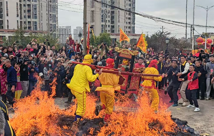 次日,實踐隊前往梧塘鎮松東村,觀摩了當地的赤腳踏火儀式。下午兩點,松木柴堆點燃后,八名青壯男子赤足抬轎,快速穿過灼熱的炭火。村老黃爺爺表示,這一儀式源于祖輩驅趕瘴氣的傳統,如今已成為一種民俗活動。