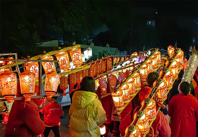 當晚,松東村還舉行了花燈巡游活動。三百余盞花燈組成千米長龍,巡游隊伍途經村內主要街道和公共場所,吸引了大量村民參與。花燈的設計融入了傳統文化元素,如“百子千孫燈”和“五谷豐登燈”,寓意吉祥與豐收。