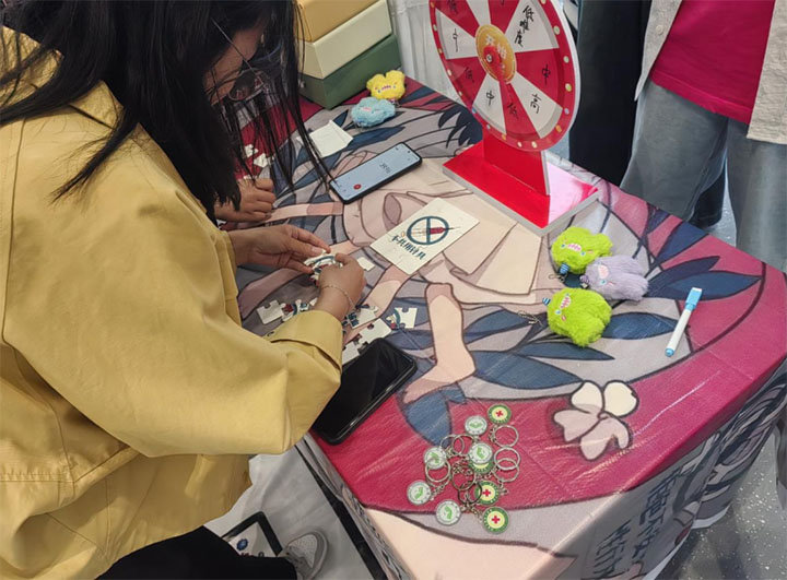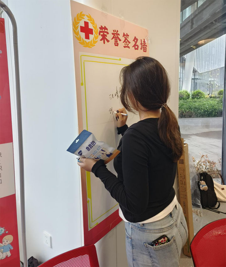 活動尾聲,通關者在紅絲帶造型的“榮譽勛章墻”上簽名并合影(圖4,圖5)。數學與統計學院紅十字會活動部部長盧鑫彤表示:“我們希望通過輕松的形式打破防艾宣傳的刻板印象,讓同學們真正‘玩’出健康意識。”