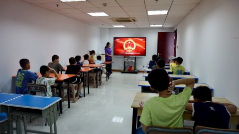 | (圖為6月27日“陵團領航暑托啟航,‘鐵軍’筑夢紅學傳揚”實踐團隊成員帶領孩子們唱國歌 鄭淘文攝) |