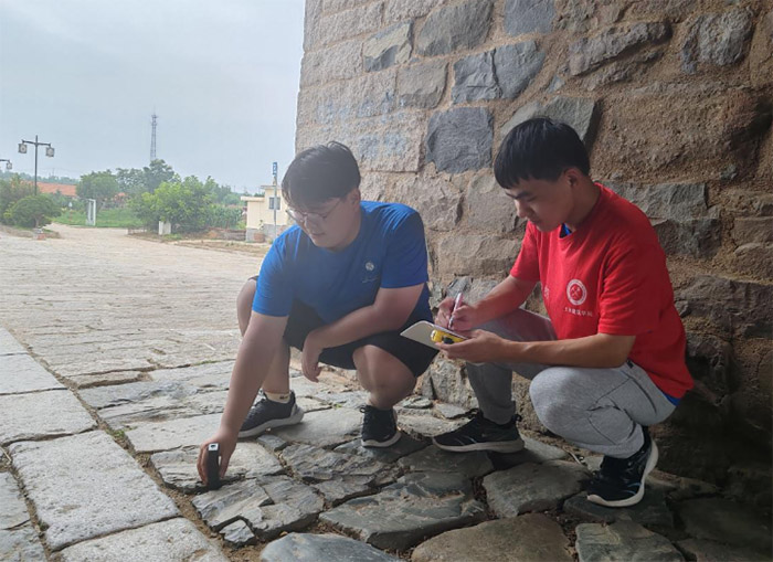 隨后,志愿隊分組協作,對古城磚石拱券等關鍵結構展開實地測量。隊員們手持測距儀、卷尺等工具,仔細測量拱券的跨度、高度與厚度,同步記錄磚石裂縫、風化等破損情況。一人專注操作儀器、校準數據,另一人詳實記錄各項參數,確保數據精準無誤,為后續古建保護開發方案制定積累一手資料。