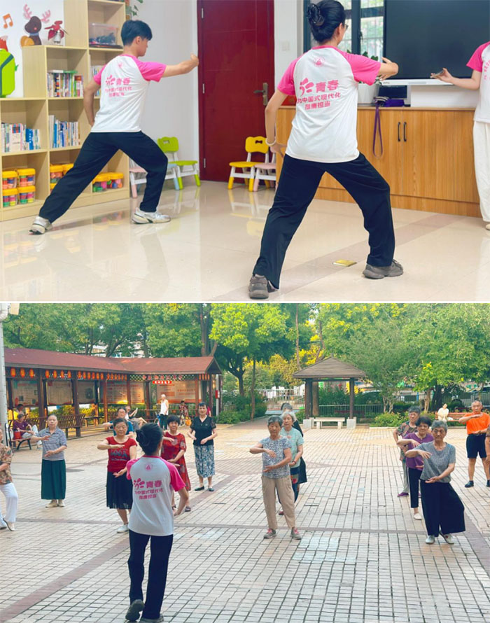 晚風吹拂喚康寧 老舞太極守寧靜 7月3日下午,實踐團隊的小伙伴們在社區二樓的舞蹈房里認真細致地進行排練,為傍晚的太極拳教學精心籌備。傍晚時分,日頭漸落,恒通社區黨群服務站門口的大廣場漸漸熱鬧起來。社區的爺爺奶奶們懷著期待的心情,陸陸續續來到廣場。團隊成員迅速架起音響設備,熱情地開啟了基礎太極拳教學環節。老人們精神矍鑠,耐心傾聽團隊教學組組長楊安琪的講解,認真模仿每一個動作,最后,團隊的小伙伴們與老人們一起,步履輕盈、剛柔并濟,一招一式盡顯太極韻味。晚風吹拂,仿佛也在為這場充滿溫情與活力的教學活動喝彩,傳遞著健康與安寧的美好祝愿。在整個教學過程中,青春力量與銀發群體相互交融、彼此感染,共同在恒通社區繪就了一道絢麗多彩的風景線。