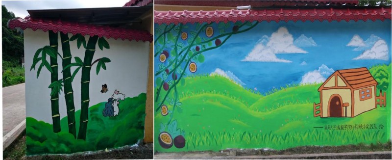 (圖為“紅韻煥鄉”實踐隊隊員們在里佳村公共區墻面上創作以“毛竹拔節”“百香果綴枝”為主題的藝術墻繪。尤富旺 供圖)