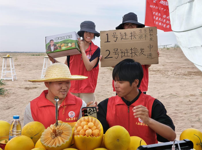 傍晚7點,團隊利用基地負責人仲麟的抖音賬號開展大學生“三下鄉”專場助農直播,聯動蘭州交通大學,助力基地銷售蜜瓜,售賣蜜瓜所得收入也將全部投入到治沙防沙基地的建設中。這場直播不僅宣傳了民勤農產品,也讓更多人了解到治沙工作的重要意義。