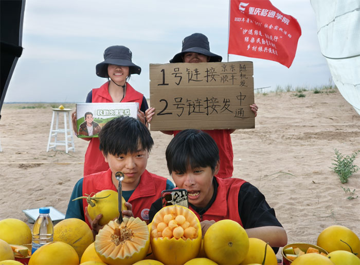 7月7日,“沙退綠進,你我共行”綠染民勤青年助農鄉村振興促進團以“雙線并行”模式展開實踐活動,一邊扎根基地揮灑汗水,一邊走進田野深入調研,同時作為截至目前唯一高校在仲麟哥本人抖音賬號上直播賣蜜瓜,用青春力量書寫治沙與生態建設的雙向奔赴。展現了新時代青年的責任與擔當。