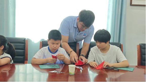 教學環節,志愿者們化身耐心的“技藝導師”。他們先示范基礎折疊方法,將紅紙對角對折、再折,一步步演示,手中紙張如被施魔法,漸漸有了對稱美感。遇到理解稍慢的孩子,志愿者便彎腰俯身,手把手糾正折疊角度,輕聲講解剪刻要點 。小朋友們學得認真,小手雖稚嫩,卻緊緊攥住剪刀,小心翼翼沿著折線裁剪。有的孩子發揮想象,在紅紙上剪出靈動的花朵、活波的小動物,也有的依葫蘆畫瓢,復刻志愿者教的傳統紋樣。教室里,紙張裁剪的“沙沙”聲與孩子們的歡聲笑語交織,化作夏日里動人的旋律 。