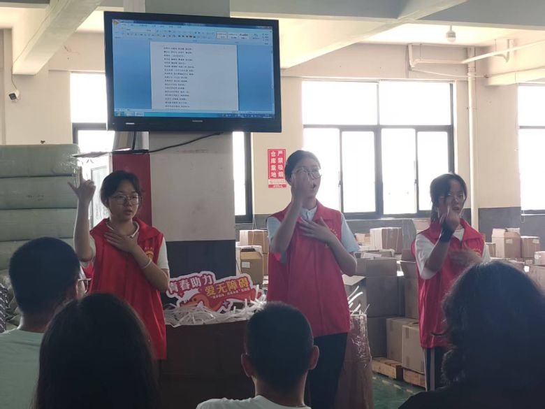 實(shí)踐團(tuán)成員精心設(shè)計(jì)了手語教學(xué)課程,從基礎(chǔ)的日常問候語入手,如“你好”“謝謝”“再見”等,通過生動(dòng)的肢體語言和耐心的一對(duì)一指導(dǎo),幫助殘障人士掌握手語的基本表達(dá)方式。為讓教學(xué)更具實(shí)用性,志愿者們還結(jié)合殘障人士的工作場(chǎng)景,教授了搬運(yùn)、指路、求助等情境下的手語表達(dá),現(xiàn)場(chǎng)互動(dòng)頻繁,氣氛熱烈。