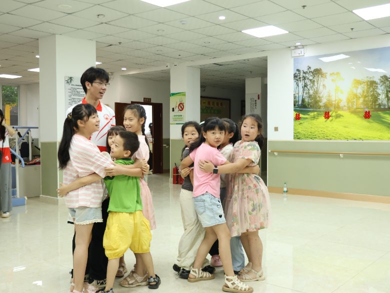 活動伊始,實踐隊員們精心策劃的“向陽花抱抱團”游戲瞬間點燃了現場氣氛。歡快旋律中,實踐隊員和孩子們圍作同心圓,隨“6朵向陽花開”的指令迅速尋找同伴相擁成團。這場精心設計的心理團輔,借數字互動破冰,讓孩子們在歡笑中敞開心扉、結識伙伴、提升表達能力,為稚嫩心靈播撒下陽光成長的種子。