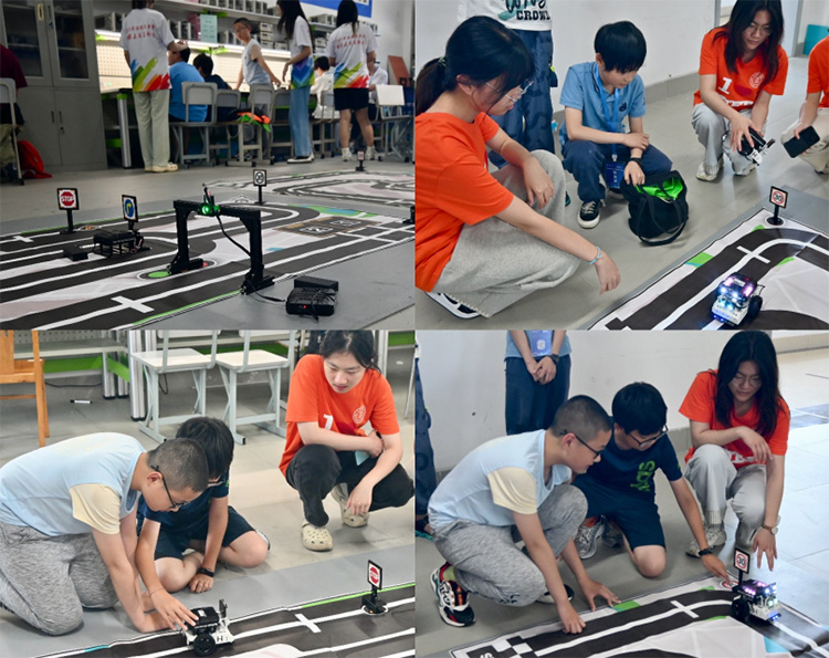 在科普講座同期,夏令營學員也正在開展智能尋道小車編程實踐。學員們分組操作小車,在模擬賽道上進行導航調試——這一場景生動呼應了橋下空間改造中"科技賦能城市"的核心主題。當陳浩同學為學員們展示調研成果時,隔壁學員們也在結合機器人實踐體驗,對"科技如何激活城市死角"展開了熱烈討論。