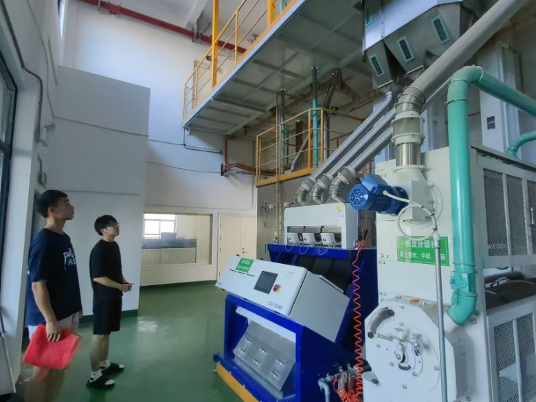 圖為團(tuán)隊(duì)成員觀摩廠房篩米設(shè)備。陳霖 供圖