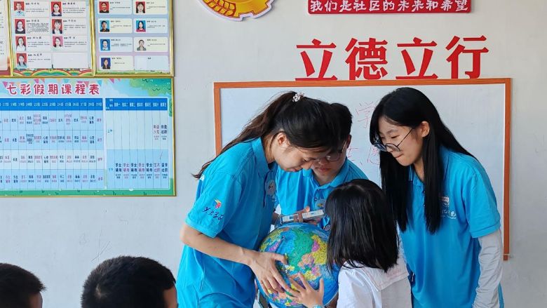 志愿者通過地球儀告訴孩子們中國位置(周雅琴攝)