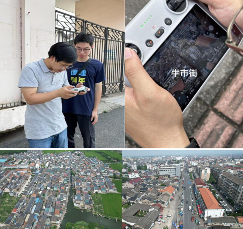 通過航拍技術深入了解街區情況: 為了獲得更直觀、全面的街區資料,下午團隊與指導老師樓瑛浩一起,操控無人機對東西大街及周邊區域進行了航拍作業。無人機從不同高度和角度拍攝了大量高清影像和視頻素材,為后續繪制街區整體布局、分析空間結構提供了珍貴的一手數據。
