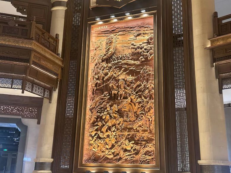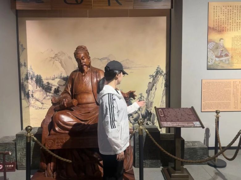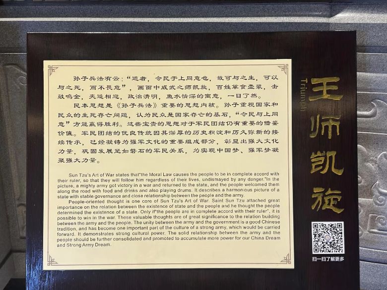 步入兵圣宮大廳,一尊8米高的漢白玉孫武雕塑瞬間吸引了實踐隊隊員的目光。孫武手持兵書,腰挎寶劍,目光深邃而堅定,仿佛正在俯瞰著整個戰場,運籌帷幄,決勝千里。他的身姿挺拔,氣勢非凡,讓人感受到了一代兵圣的卓越風采和超凡智慧。圍繞著雕塑,四幅東陽木雕依次展開,細膩地描繪了古代將帥指揮作戰的全過程。從戰前的精心謀劃,到戰場上的靈活應變,再到勝利后的凱旋而歸,每一個場景都充滿了緊張與激情,讓實踐隊隊員仿佛置身于那個戰火紛飛的年代,親身感受到了戰爭的殘酷與無情,以及兵家謀略的重要性。
