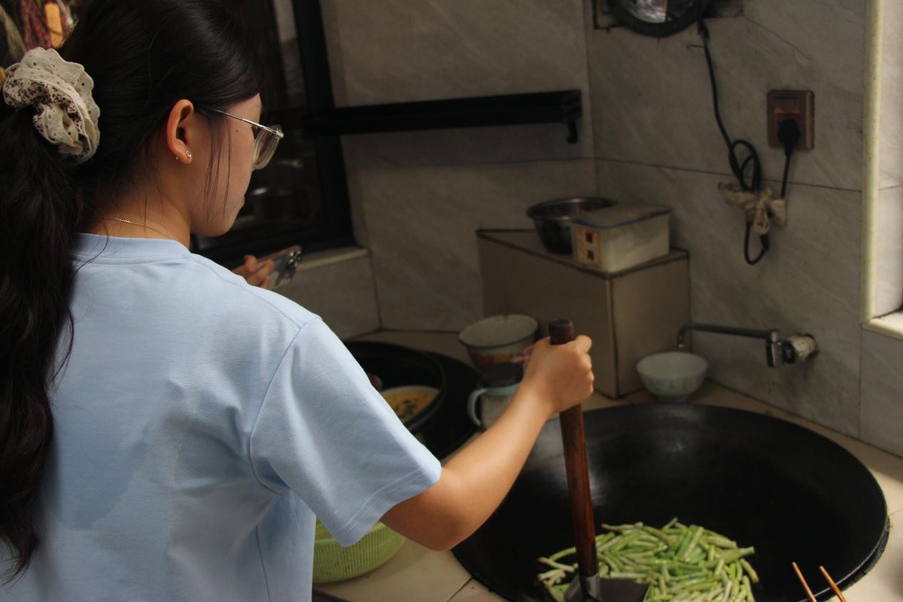 實踐隊員張茜在炒豆角 許祥瑞攝