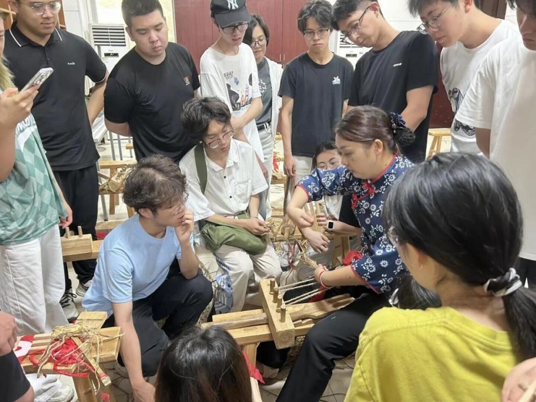 7月8日的草鞋課堂上,學員們在聆聽講解后開始動手實踐。從搓草繩的生疏到編鞋底的專注,食品科學技術學院食安2303班周嘉欣的手掌被磨出紅痕,卻笑著感悟:“