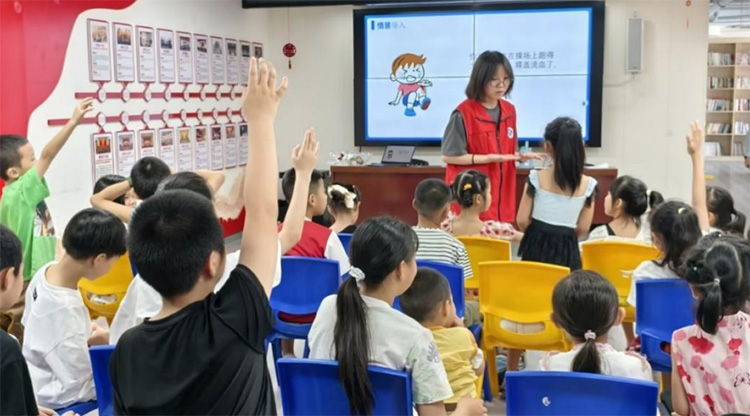 隨后進行的“急救知識快問快答”環(huán)節(jié)將活動推向了高潮。孩子們熱情高漲,爭相搶答,現(xiàn)場氣氛緊張而熱烈。每一個正確的回答都贏得了熱烈的掌聲和贊許的目光,而答對的孩子們更是滿心歡喜地領取禮品,這不僅是對他們知識掌握的肯定,更是對他們學習熱情的鼓勵。在歡快的音樂聲中,活動接近尾聲,志愿者與孩子們合影留念,記錄下這溫馨而有意義的瞬間。志愿者代表深情倡議:“讓我們把急救知識帶回家,不僅守護自己的生命,也能在他人需要時伸出援手。人人爭做生命守護者,用知識為生命保駕護航!”