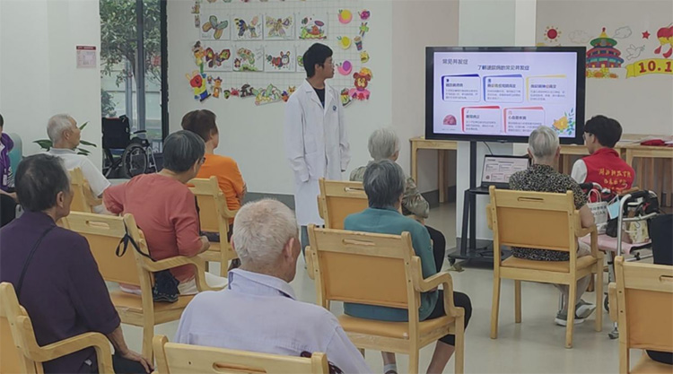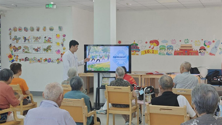 活動現場,實踐隊員化身健康科普宣傳員,針對高血壓、糖尿病等老年高發慢性病,通過“醫學知識+生活案例”的生動講解,將專業術語轉化為“聽得懂、記得住、用得上”的健康指南,為老人們送上科學養生的“及時雨”。特別設計的“指尖健康操”互動環節,讓老人們在輕松的音樂中活動關節,實踐隊員手把手教學指導,指尖躍動間不僅鍛煉了肢體協調能力,更搭建起情感溝通的橋梁,使健康宣教在歡聲笑語中入腦入心。