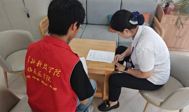 除了健康科普宣傳環節,團隊還采用“問卷+訪談”的立體調研法,深入了解老年群體健康需求痛點與康養服務現狀,為優化社區健康服務提供數據支撐。此次調研范圍不僅涵蓋老年群體,還特意加入了護工人員與康養中心工作人員。針對視力不佳的老人,隊員們逐題讀出選項;遇到聽力障礙的,則用事先準備的圖文卡片輔助溝通。面對護工群體,隊員們設計了專門的問卷,內容涉及日常照護中遇到的健康知識盲區、希望獲得的專業培訓等。2小時里,整理出“希望增加中醫理療”“需要定期上門體檢”等條核心需求。同步發放的《中國老年人健康指南》,實現了健康知識從“普及”到“精準配送”的升級。