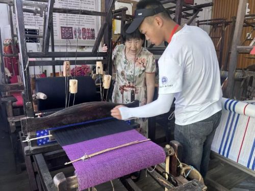 在陶師傅和陶母許可下,兩位老師傅耐心細致地示范、講解,手把手地指導實踐隊員如何使用織機。就在我們專注聆聽陶師傅講解技巧時,一個小身影吸引了大家的目光——陶師傅的小女兒,正安靜地在一旁抬頭看著父親指導哥哥姐姐們的動作,眼神里充滿了專注與好奇。