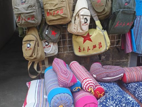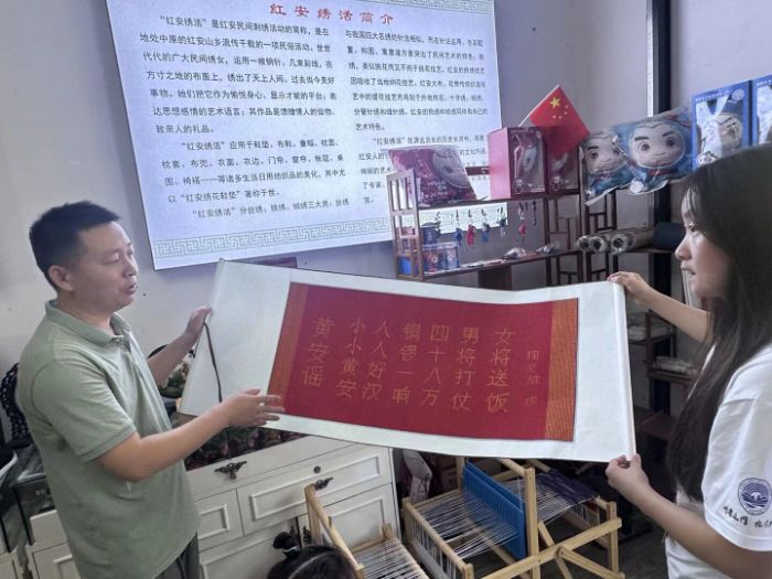 陶師傅還向我們展示了織在紅安大布上的《黃安謠》。陶師傅將《黃安謠》的詞句化作布面上的星火圖騰——用赭紅鋪成歷史底色,以金黃勾勒出“小小黃安,人人好漢,銅鑼一響四十八萬,男將打仗,女將送飯”的字樣,讓飛梭在經緯間穿梭出永不褪色的革命記憶。