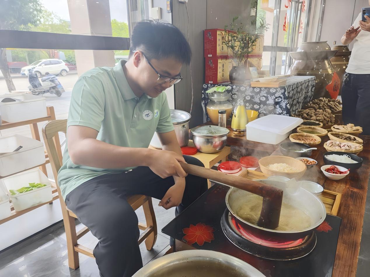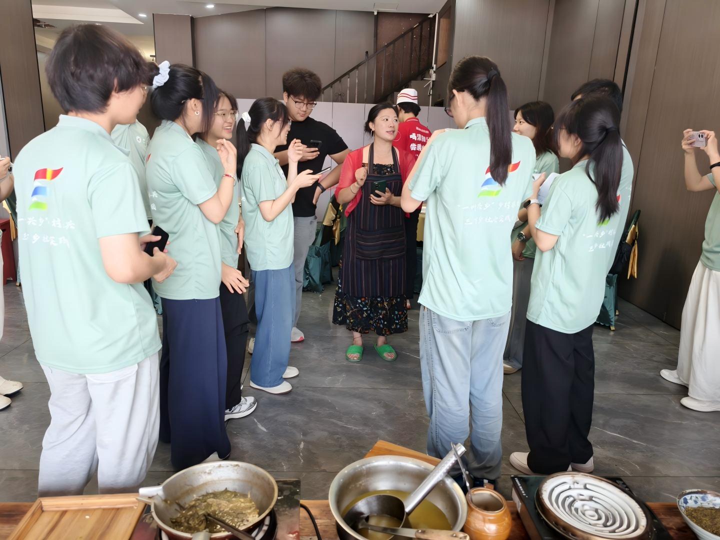 “扁擔女孩”耐心示范炒茶火候把握、舂茶力度運用以及熬煮時長等秘訣,實踐團圍在灶臺旁耐心觀看。部分成員親自體驗油茶烹煮過程,他們小心翼翼地親手翻炒茶葉,聽著鐵鍋發出的“滋滋”聲,緊握著木杵,有節奏地舂擊茶料,看著茶湯在鍋中慢慢變得濃醇,臉上洋溢著成就感。通過這次親身體驗,成員們深刻感受到了灌陽油茶制作的精湛技藝和獨特魅力。
