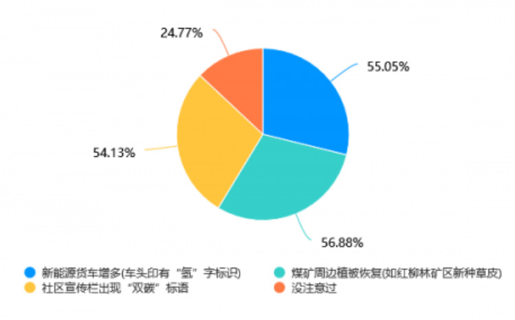環境變化中,55.05%的受訪者注意到新能源貨車增多,56.88%觀察到煤礦周邊植被恢復。且對綠色轉型持積極看法的人群,對環境變化的關注度更高,如認為空氣更清新的受訪者中,63.93%注意到新能源貨車增多。