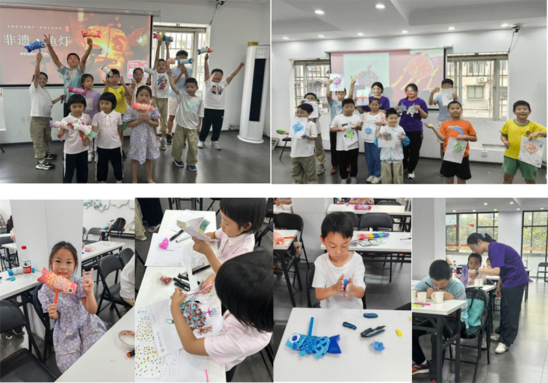 “非遺魚燈”“繡球”課程里,孩子們在觀看科普視頻后,用紙杯、黏土親手制作非遺手作;皮影戲動畫《漏》的放映引發(fā)熱烈討論,志愿者趁機講解皮影戲的歷史淵源;“甲骨文創(chuàng)意手工”活動中,卡紙與黏土變成古老文字的載體,讓傳統(tǒng)文化在指尖流轉。