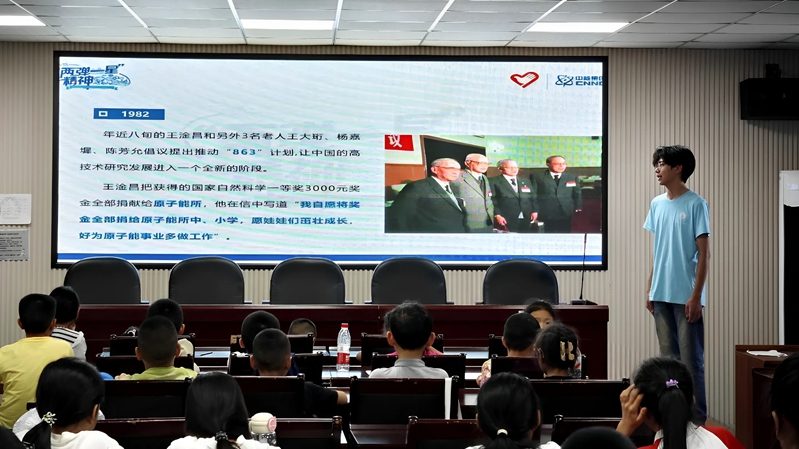 宣講的核心,聚焦于“兩彈一星”元?jiǎng)淄蹁撇壬鸷橙诵牡囊簧V驹刚唢柡匆猓告傅纴?lái):他才華橫溢,三次重大研究成果與諾貝爾獎(jiǎng)擦肩,卻在祖國(guó)召喚之際,毅然放棄個(gè)人榮譽(yù)與國(guó)際聲望,以“我愿以身許國(guó)”的誓言投身核事業(yè)。更令人動(dòng)容的是,他化名“王京”,隱姓埋名十七載,將個(gè)人榮辱置之度外,默默耕耘于戈壁深處。當(dāng)孩子們聽(tīng)聞王淦昌先生為國(guó)之重器甘愿舍棄諾獎(jiǎng)殊榮,并“消失”十七年時(shí),無(wú)不深受震撼。課堂鴉雀無(wú)聲,孩子們清澈的眼眸中交織著難以置信與深深的敬佩。王淦昌先生用生命詮釋的“熱愛(ài)祖國(guó)、無(wú)私奉獻(xiàn),自力更生、艱苦奮斗,大力協(xié)同、勇于登攀”的“兩彈一星”精神,在深情講述中變得無(wú)比鮮活。