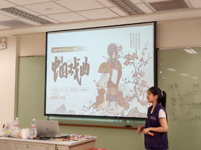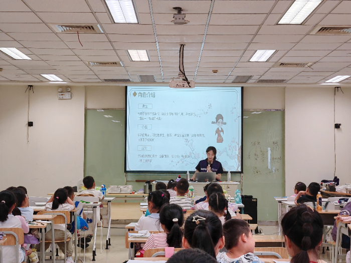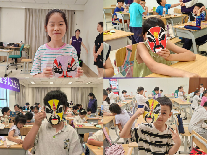 7月15日的京劇課堂上,李老師執(zhí)扇而立,為孩子們講解生、旦、凈、末、丑的行當(dāng)特色并示范經(jīng)典唱段。“紅臉忠勇,白臉奸詐,”她輕點(diǎn)電子屏上的關(guān)羽臉譜,“臉譜是角色的第二張臉,方寸之間寫(xiě)滿角色的忠奸善惡。”孩子們興致勃勃地跟著李老師試唱,課堂氣氛熱烈。