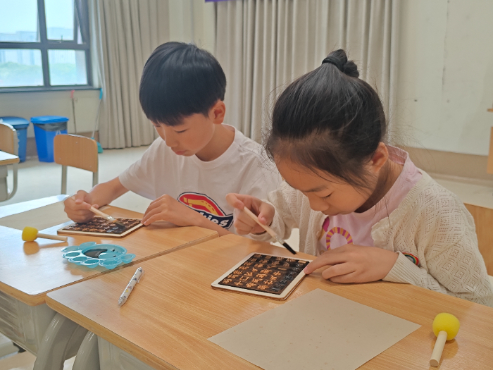 兩日后的實(shí)踐課上,孩子們屏息凝神,將散落的鉛字如拼積木般排列成古詩(shī)。宣紙之下,墨輥輕壓,王維“明月松間照”的詩(shī)句躍然紙上。8歲的朵朵興奮地舉起作品:“看!我印的唐詩(shī)會(huì)發(fā)光!”