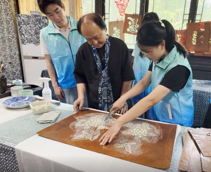 匠心對話:非遺傳承人的堅守與開拓 “藍印花布制作有十余道工序,從選布、脫脂、裱糊到刻板、染色、晾曬,每一步都需精準把控”。國家級非遺傳承人吳元新大師一邊演示刮漿技藝,一邊向成員們耐心講解。年過六旬的他,是南通藍印花布的“活字典”。四十年來,吳元新大師致力于傳承和保護藍印花布非遺技藝,1996年創辦全國第一家藍印花布博物館,帶領團隊走進江蘇、浙江、湖南、山東、北京等全國21個藍印花布主要產區,搶救保護明清以來藍印花布實物遺存六萬余件,整理經典紋樣二十余萬個,研究出版專著十余部,多件精品被國家博物館、中國工藝美術館等機構館藏陳列,吳元新大師不遺余力的守護與傳承讓藍印花布技藝在新時代中不斷綻放異彩。