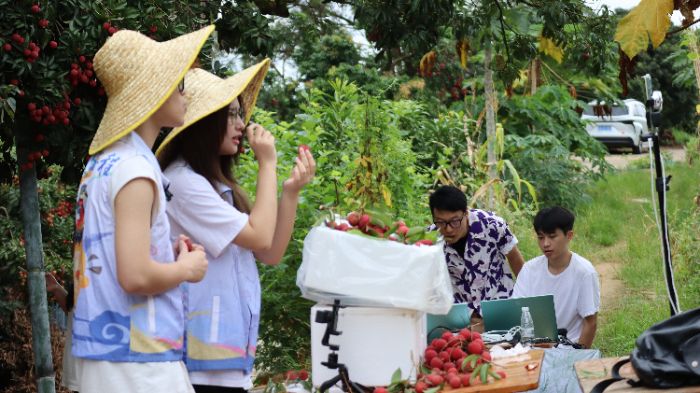 在當(dāng)?shù)卮鍟浀膸ьI(lǐng)下,廣東財(cái)經(jīng)大學(xué)“荔香蜜韻”實(shí)踐團(tuán)走訪多家當(dāng)?shù)剞r(nóng)戶,了解到部分農(nóng)戶電商販“荔”的層次需求。同時,實(shí)踐團(tuán)來自廣東財(cái)經(jīng)大學(xué)的指導(dǎo)老師史專紅、黃蝶君,以及來自華南農(nóng)業(yè)大學(xué)的指導(dǎo)老師李樺親臨桃蓮村,在當(dāng)?shù)?ldquo;禧和驛站”民宿與實(shí)踐團(tuán)全員,當(dāng)?shù)卮鍟洠袼拗骼砣斯采绦聲r代荔枝經(jīng)濟(jì)發(fā)展趨勢,敲定在助農(nóng)大環(huán)境下搭建多方合作橋梁,以“場地+農(nóng)戶+直播”的模式構(gòu)建新型荔枝經(jīng)濟(jì)。