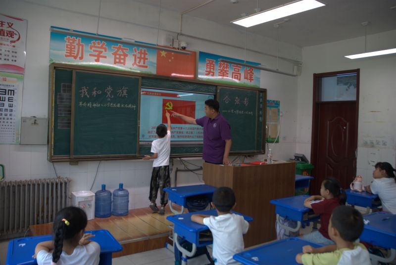 為助力大中小學思政課一體化建設的推進,切實發揮思政課立德樹人關鍵課程作用,深入調研革命精神在小學思政課中的融入情況,7月18日,山東理工大學愛之傳承暑期社會實踐團負責人趙康棋在明德小學開展了“我和黨旗合張影”主題教育課程,將紅色基因的種子深深埋在每一位小朋友的心中。