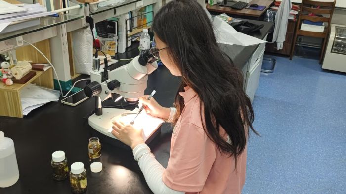 04 圖為隊員在顯微鏡下整理所采集到的標(biāo)本 青島農(nóng)業(yè)大學(xué)李心怡提供