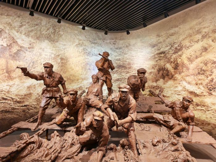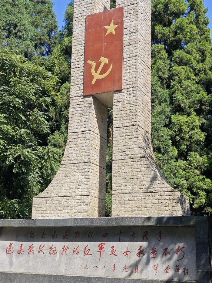 前行至紅軍戰斗紀念碑,雙柱象征“二渡赤水”軍事行動,開國上將張愛萍手跡“遵義戰役犧牲的紅軍烈士永垂不朽”與《西江月·遵義大捷》引人緬懷。
