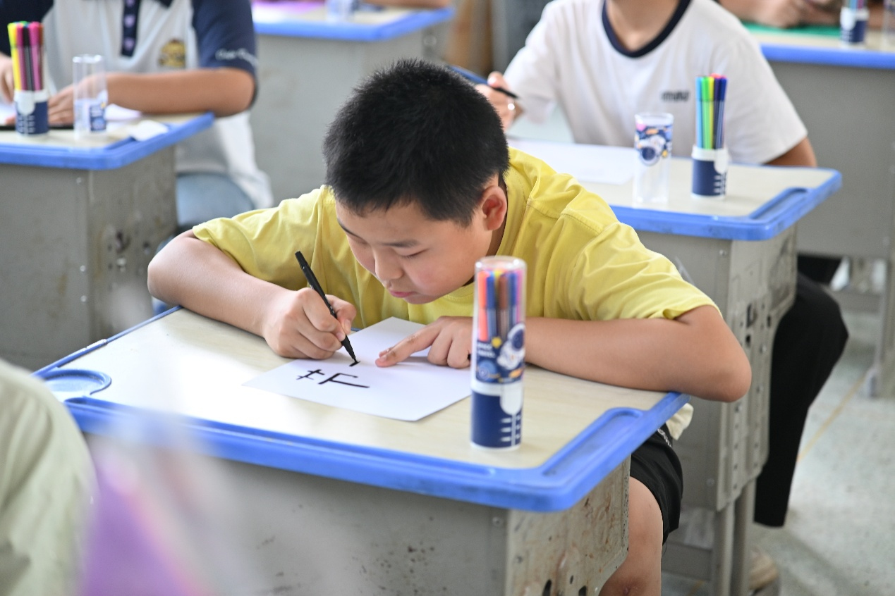 圖為小朋友們正在卡紙上寫下節(jié)水護(hù)水標(biāo)語 農(nóng)姚 陳立志攝