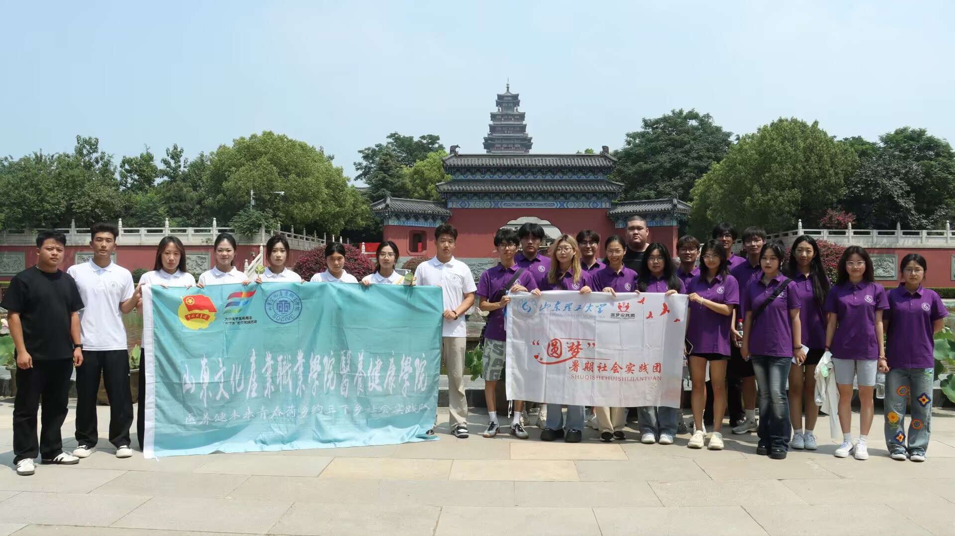 實(shí)踐團(tuán)一行來(lái)到望湖塔下。這座通體呈青灰色的塔樓拔地而起,塔身層層收窄,頂端的寶剎在陽(yáng)光下熠熠生輝。而正當(dāng)大家準(zhǔn)備聆聽(tīng)導(dǎo)游介紹望湖塔的歷史時(shí),意外地遇到了同樣來(lái)此開(kāi)展社會(huì)實(shí)踐活動(dòng)的山東文化產(chǎn)業(yè)職業(yè)學(xué)院的實(shí)踐團(tuán)成員。兩校實(shí)踐團(tuán)成員相見(jiàn)甚歡,紛紛熱情打招呼,短暫交流后得知,雙方都希望通過(guò)此次微山島之行,深入了解當(dāng)?shù)匚幕S富了實(shí)踐經(jīng)歷。隨后大家在微子文化苑門(mén)前一同合影,共同紀(jì)念此次文化之旅。