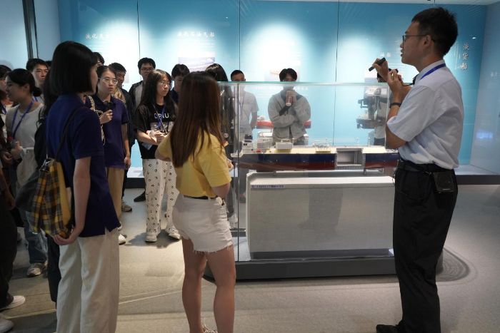 在船舶文化館內,營員們系統了解了中國船舶從古至今的演進歷程。從鄭和寶船的精巧到現代巨輪的恢弘,豐富的模型與圖文史料生動展現了船舶技術的飛躍與國家海洋事業的成就。營員們認真聆聽講解,對展品表現出濃厚興趣,深刻感受到源遠流長的船舶文化魅力與現代科技的蓬勃力量。