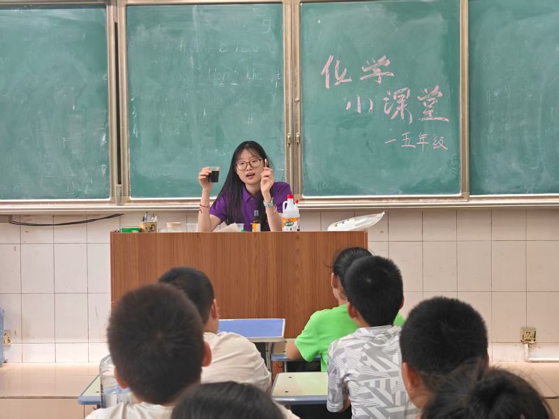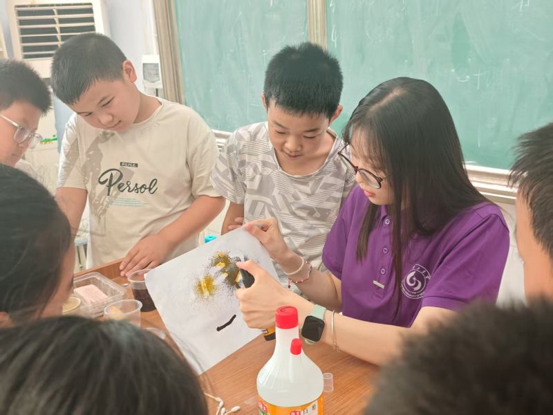 為了提升小朋友們們的科學素養,培養他們的科學興趣,發展實踐動手能力,7月21日,山東理工大學愛之傳承暑期社會實踐團應用化學專業的梁洪年同學在明德小學開展了化學實驗趣味課程,讓小朋友們在體驗中培養興趣,在探索中提出疑問,在思考中啟迪智慧,在精彩紛呈的化學實驗中初窺世界的奧妙。