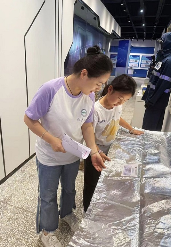 活動(dòng)伊始,小朋友們?cè)谛v團(tuán)志愿者謝宜軒的帶領(lǐng)下,井然有序地參觀了南通大學(xué)安全防護(hù)用特種纖維復(fù)合材料研發(fā)國家地方聯(lián)合工程研究中心。在明亮的展廳里,孩子們的注意力立刻被琳瑯滿目的高科技防護(hù)材料所吸引。志愿者逐一引導(dǎo),用孩子們能理解的語言,揭開了特種纖維守護(hù)生命的奧秘:生化防護(hù)服如同隱形的盾牌,讓孩子們明白科學(xué)家如何隔離看不見的危險(xiǎn);輻射防護(hù)裝備讓大家知道如何安全地與特殊能量打交道;堅(jiān)固的防彈頭盔與防切割手套展示材料如何化身“鎧甲”守護(hù)大家的安全;可抵御火焰灼燒和高溫輻射的應(yīng)急避火罩給森林火災(zāi)中的消防英雄提供臨時(shí)的保護(hù);醫(yī)用的抗菌隔離材料則傳遞著對(duì)健康的守護(hù);而實(shí)現(xiàn)控溫的智能可穿戴服裝,更讓孩子們直呼“衣服也變聰明了!”。