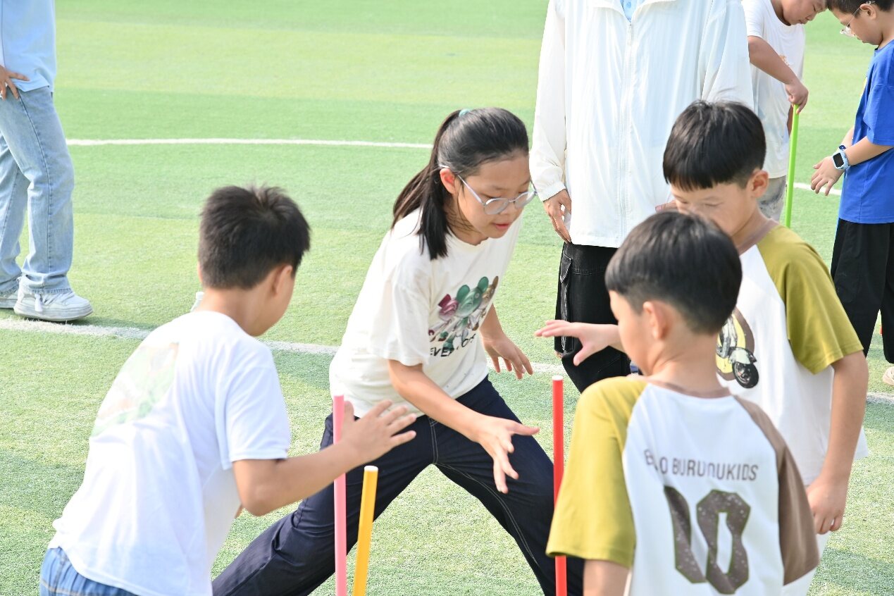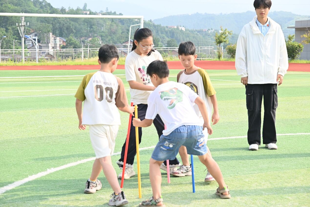 協(xié)作逐光——在協(xié)作與奔跑中凝聚力量午后的趣味運動會,“不倒森林”率先開場。實踐隊員汪昊天和羅錦旺帶領(lǐng)孩子們手握長棍圍成一圈,起初棍子頻頻倒地,嘆息聲中卻透著不服輸?shù)捻g勁。幾番練習(xí)后,目光交匯,默契悄然滋生。放手、移步、承接,動作流轉(zhuǎn)間,無形的絲線將瞬間精準(zhǔn)串聯(lián)。當(dāng)最后一根長棍穩(wěn)穩(wěn)立住,成功的歡呼如熾風(fēng)般席卷操場。